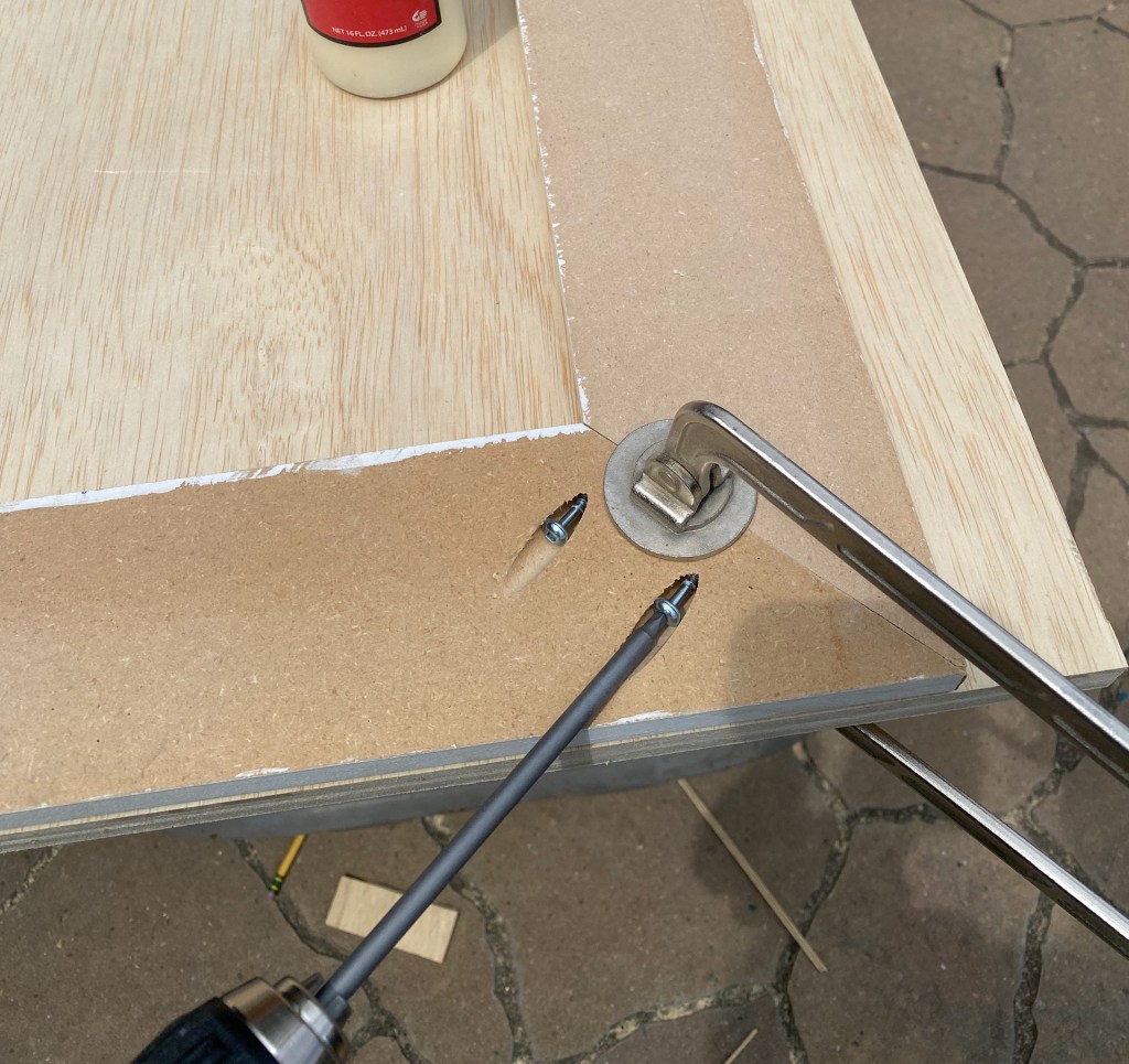 Place a small amount of wood glue on one of the miter joints and join it with the other miter edges. Use a clamp to keep it in place while screwing the joints together.