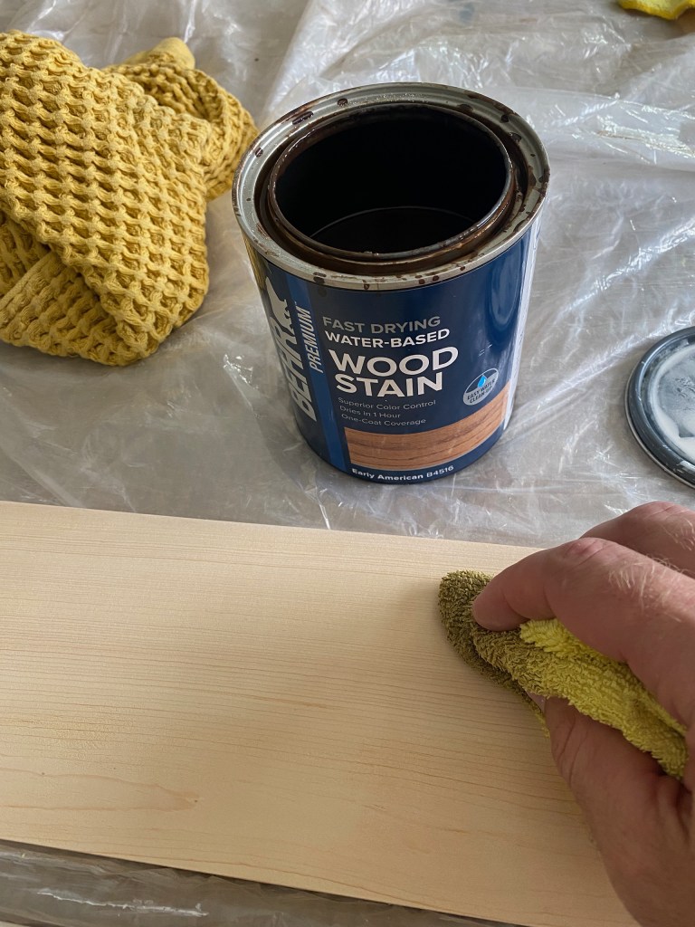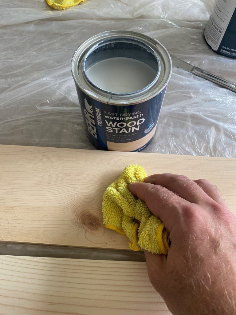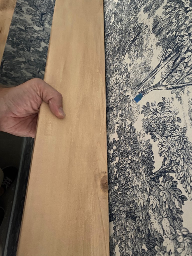 Here is our DIY hack: cut the select pine slats length-wise (half the cost)! Ok, lets start with the floating shelves. I used 1′ x 8 ‘ x 6″ common board. We cut it down to 5 feet with a depth of 5 inches. In the end I had to use the left over pieces for some slats since I ran out (miscalculated). I stained all our wall slats and shelves with the white wash first then the early American stain. Don’t forget to pre-stain!