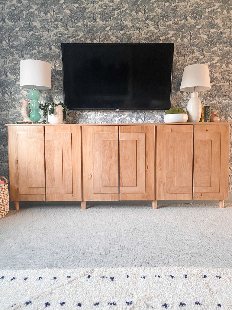Since we are using 3 Ivar cabinets, attach all 3 together with 1 inch screws. We wanted somewhat of a “table/console” look so we purchased some furniture legs from Amazon. Fortunately, these were a super close match with our wood finish (bonus)! They also provided more support to the cabinets since they will be screwed into the wall like kitchen base cabinets.