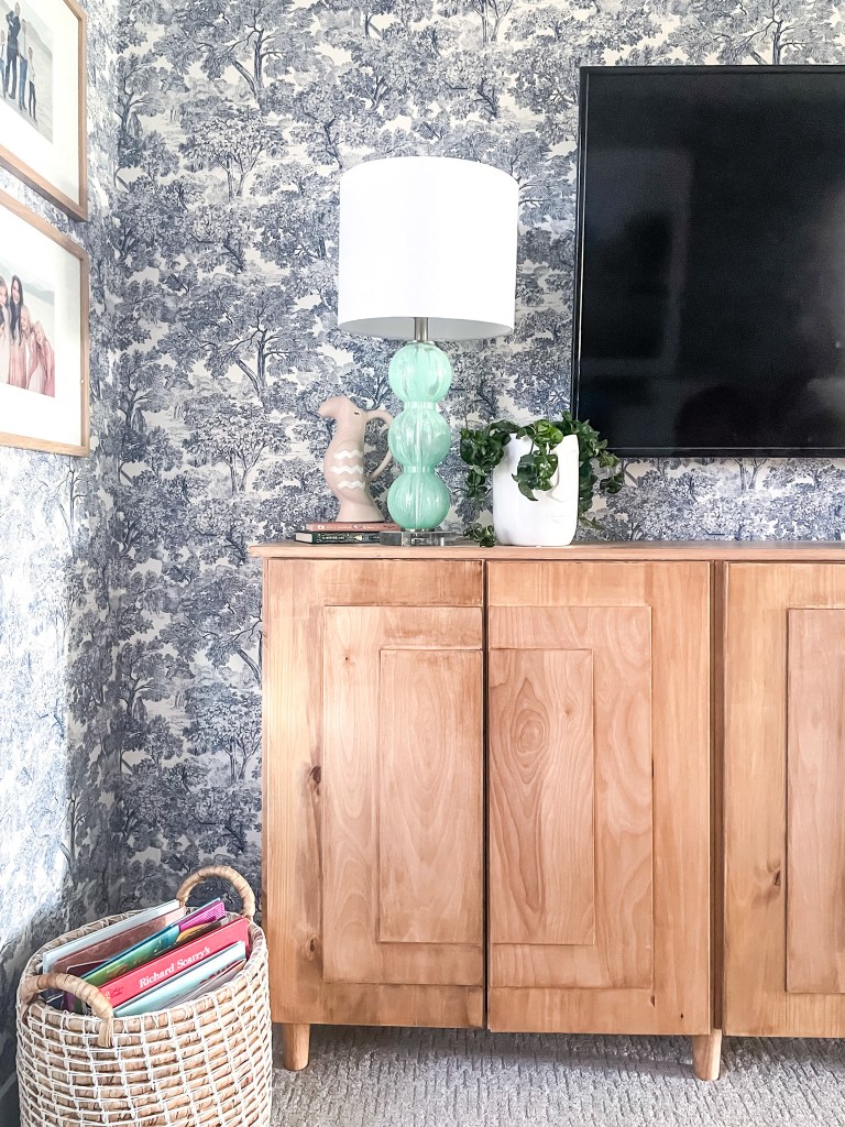 The IKEA Ivar cabinets are not only good for storage systems–they also offer a versatile assortment of finishing touches such as paint, texture or classic wood finishes. We have also used these adaptable cabinets in our laundry room remodel. For this specific project, we were looking for something that could store all of our existing children’s books, but also add a look of sophistication with the busy wallpaper we added to the room (more on that in another post). A classic wood finish was a must for this project.