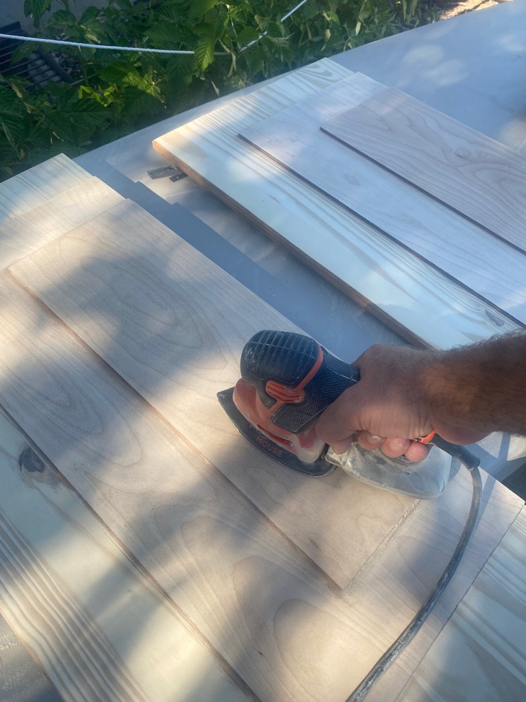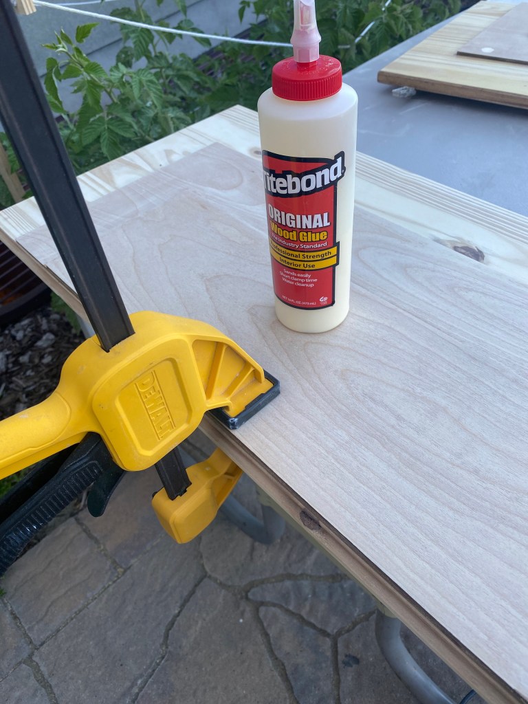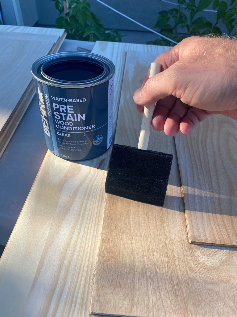 I used a table saw to cut them down to size then clamped them together with wood glue. It doesn’t take long to dry so you can sand them down after about 20 minutes of drying. The wood did not exactly match, however, the wood conditioner and white wash will help even out the wood variation. Two coats of wood conditioner and 20 minutes of drying time is sufficient.