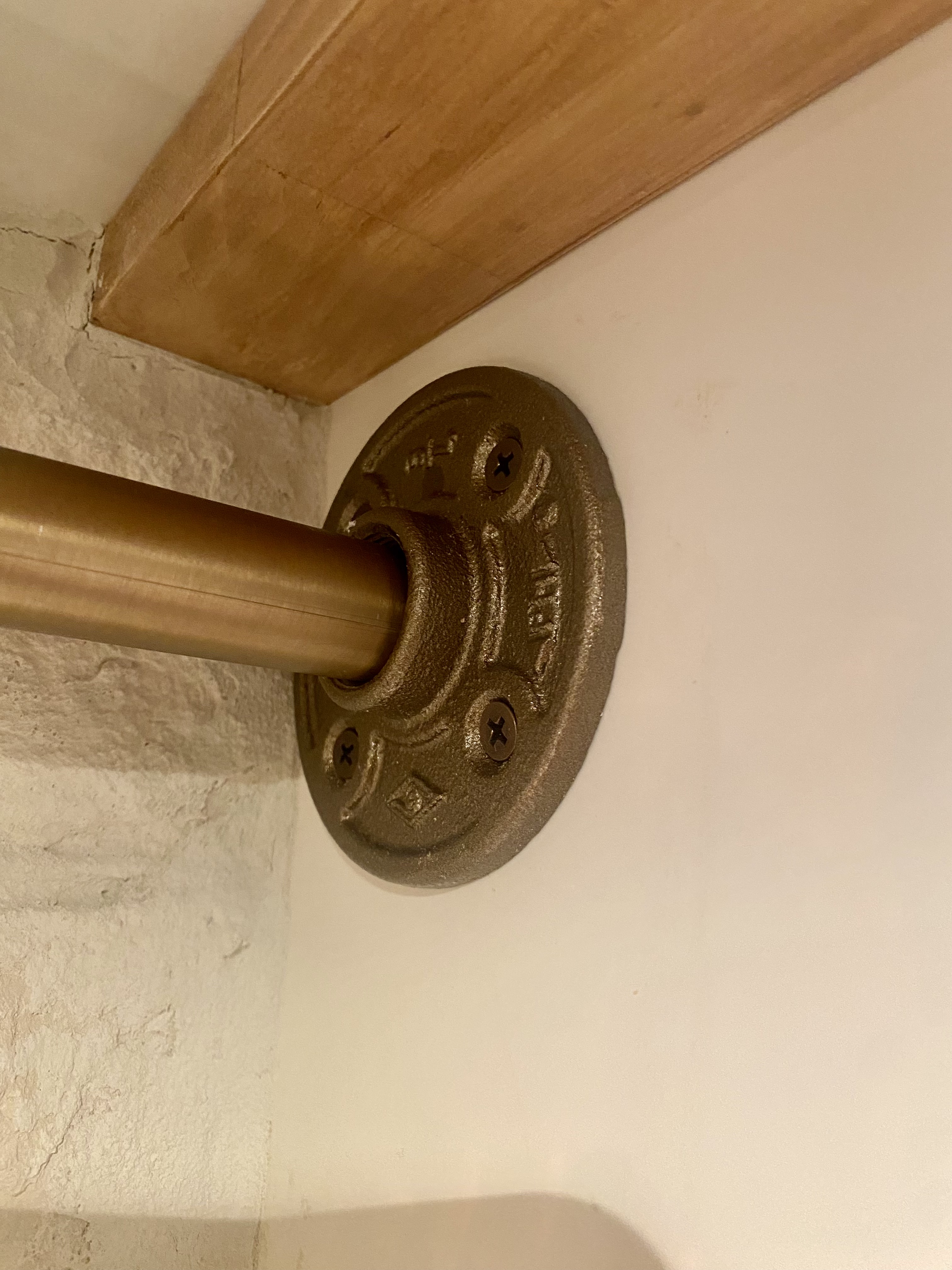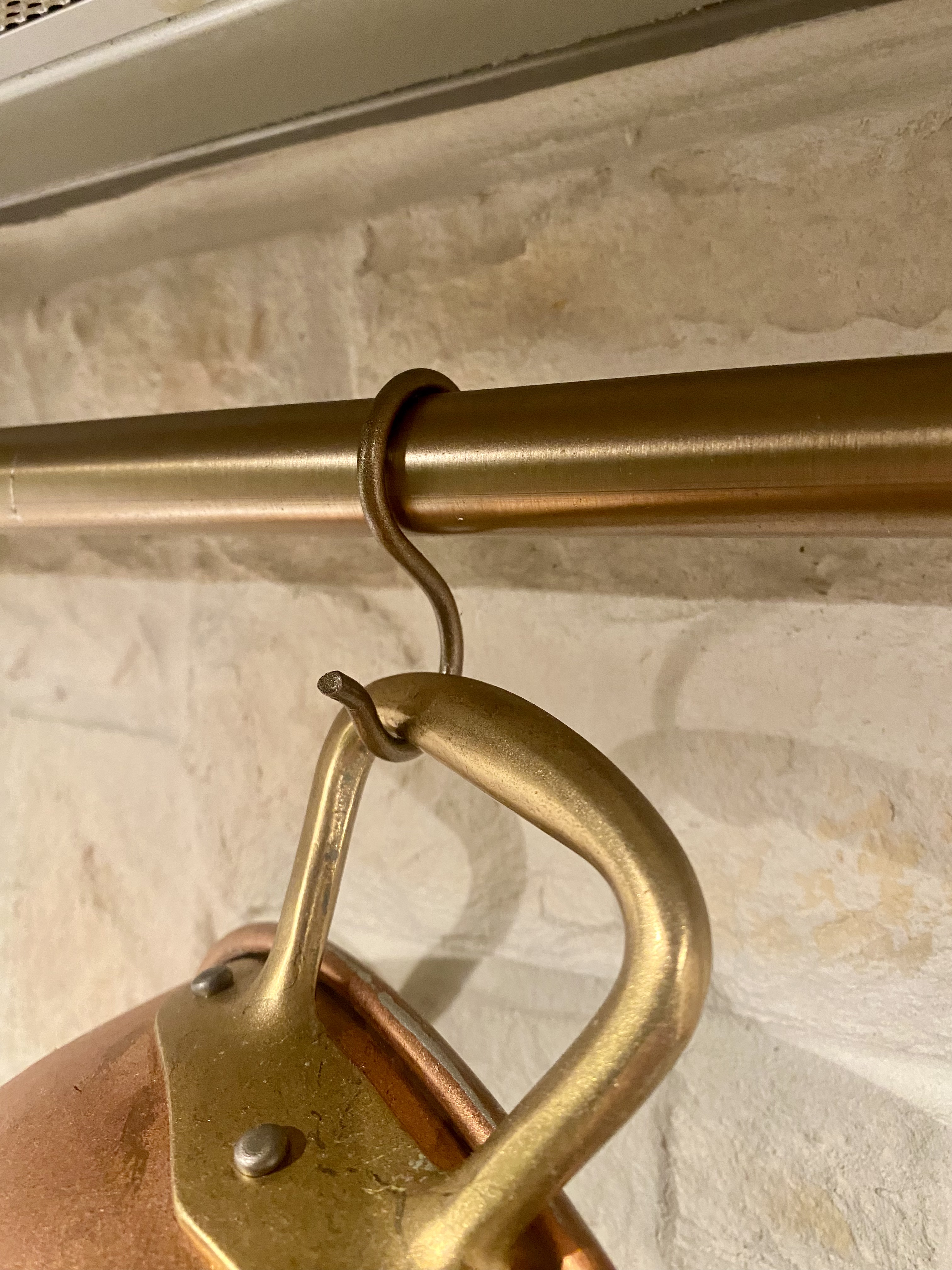 Look for an old curtain rod that you no longer need (you know those ones that you step over in your storage rooms or garage), ensuring it’s sturdy and can handle the weight of your copper pots. Purchase pipe flanges that fit the diameter of your curtain rod and choose a finish that complements your kitchen decor.