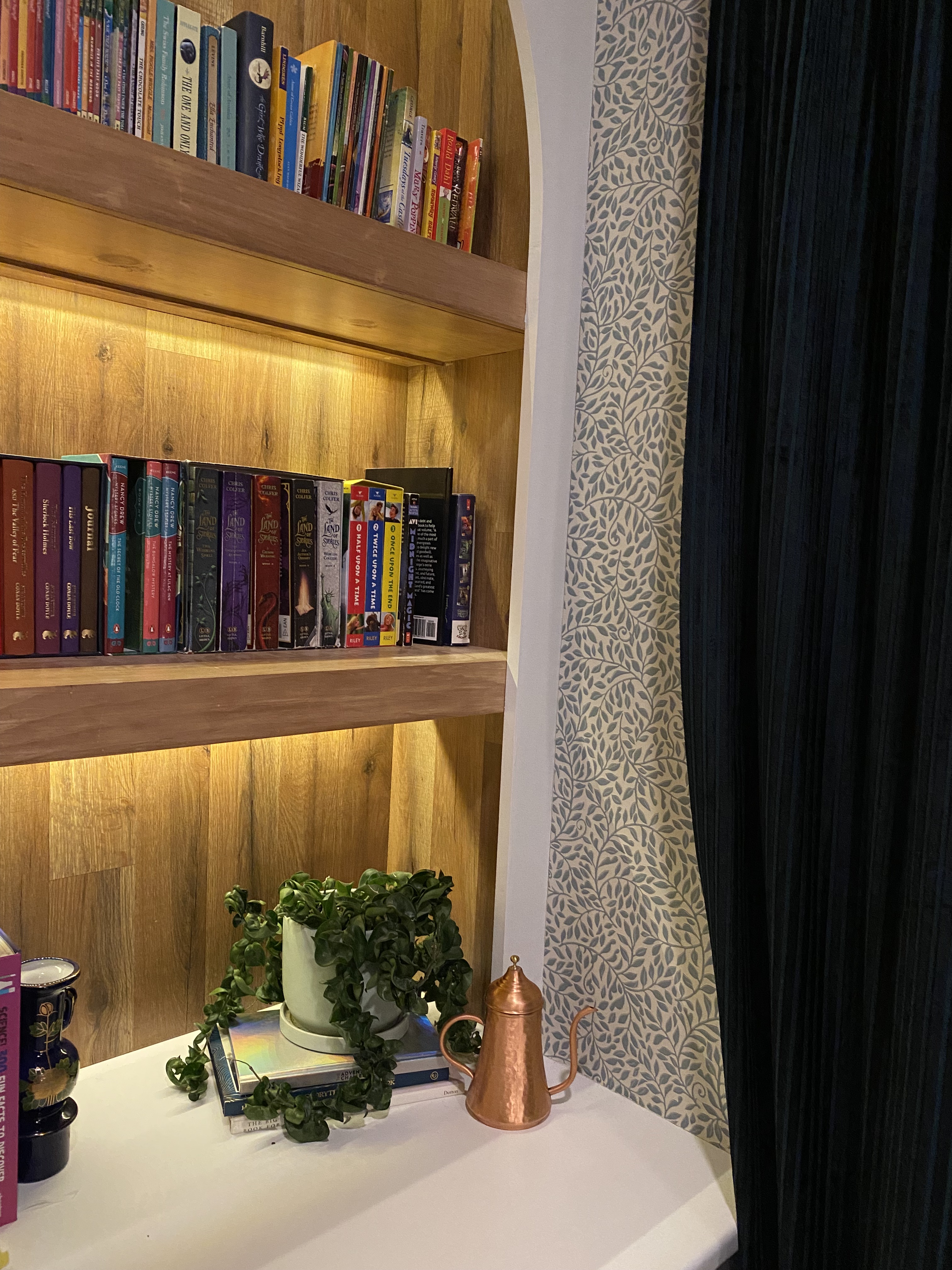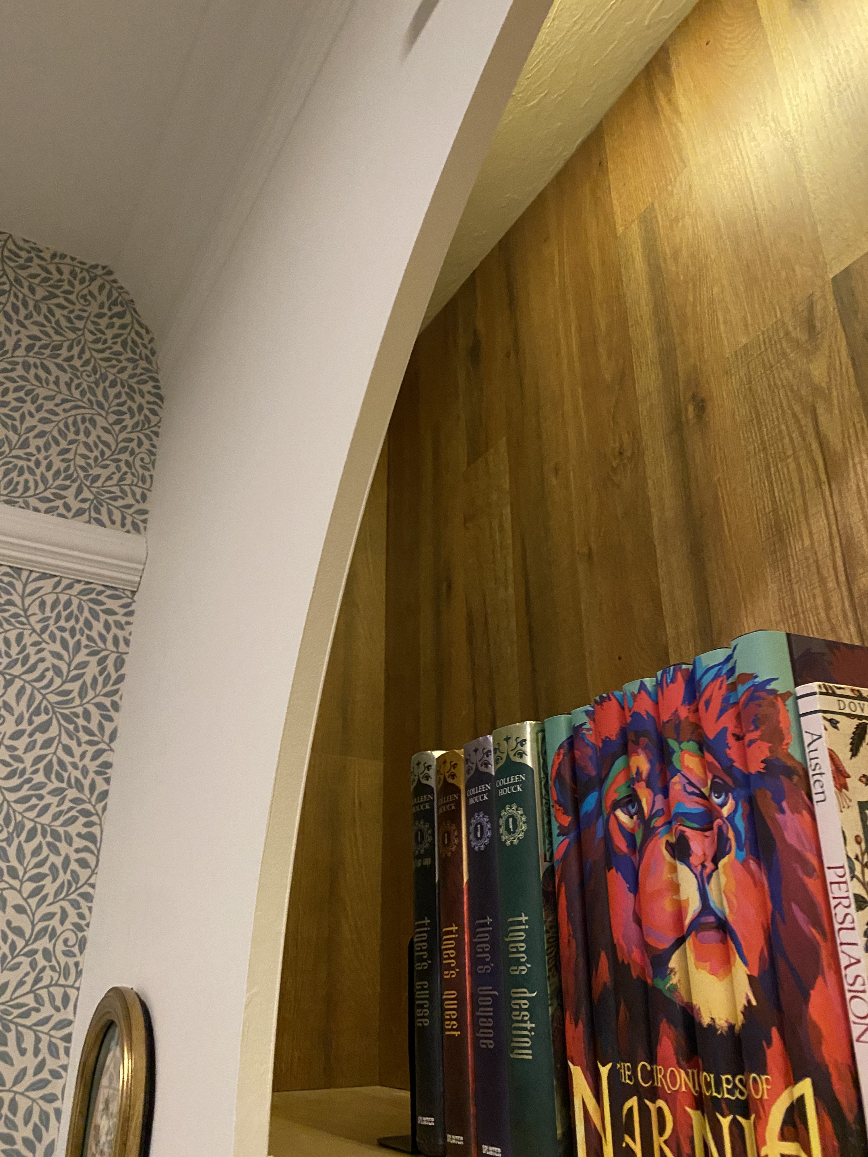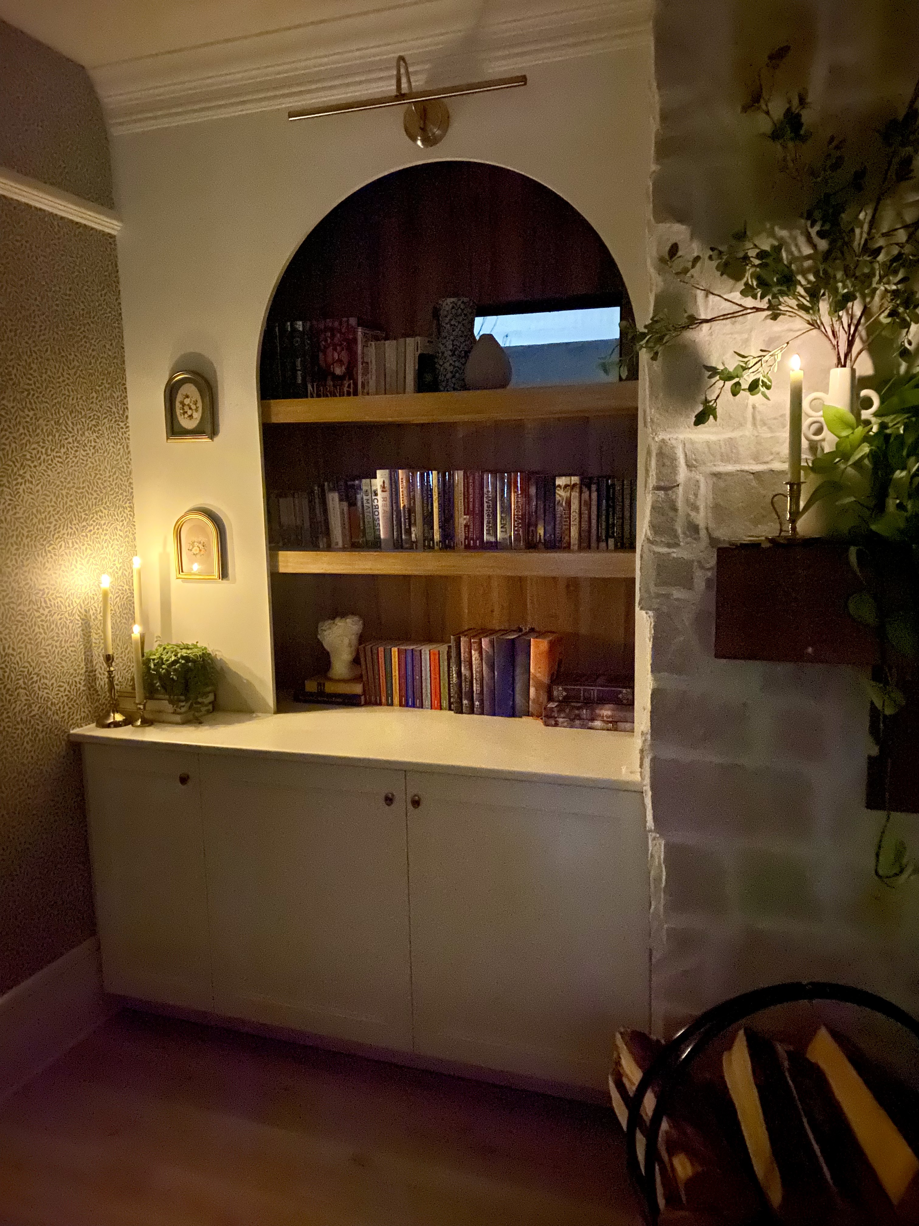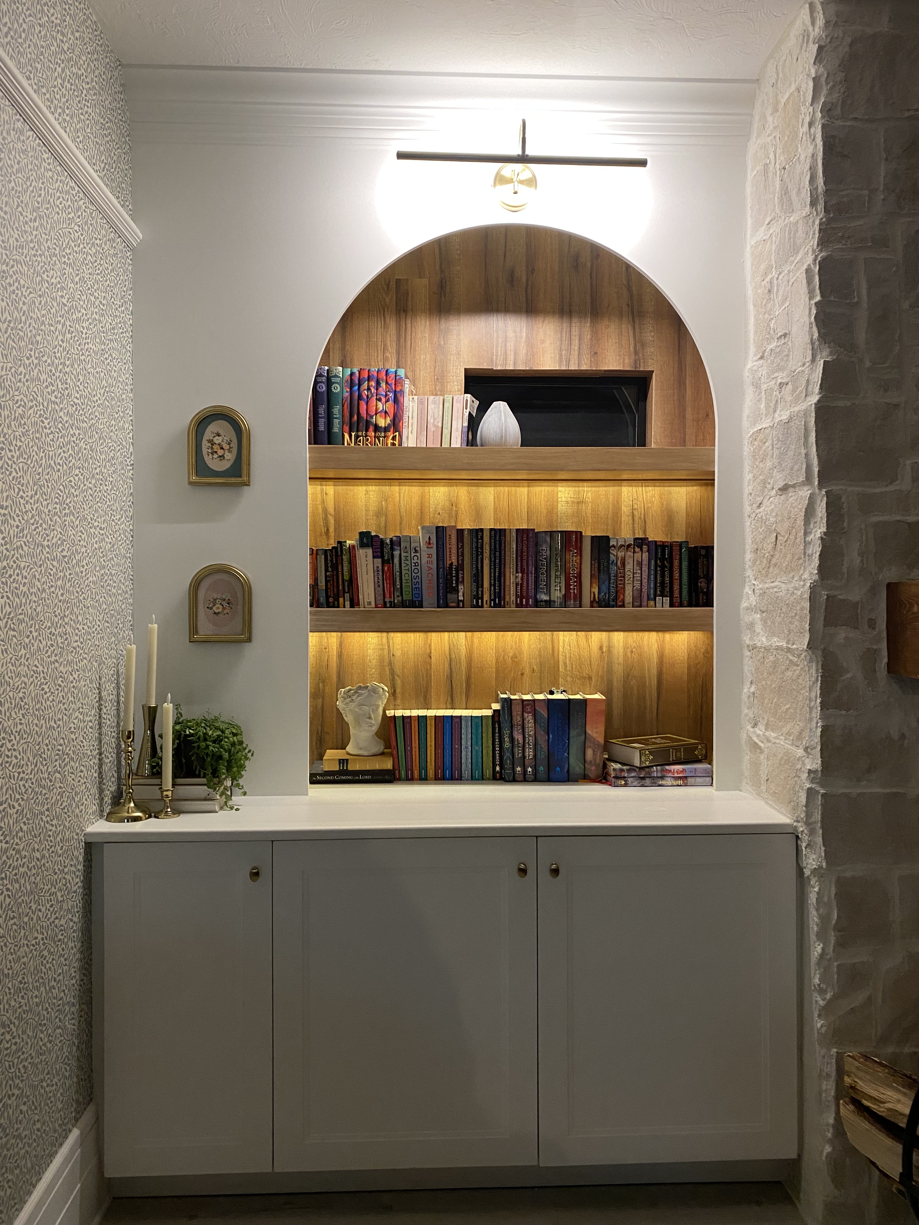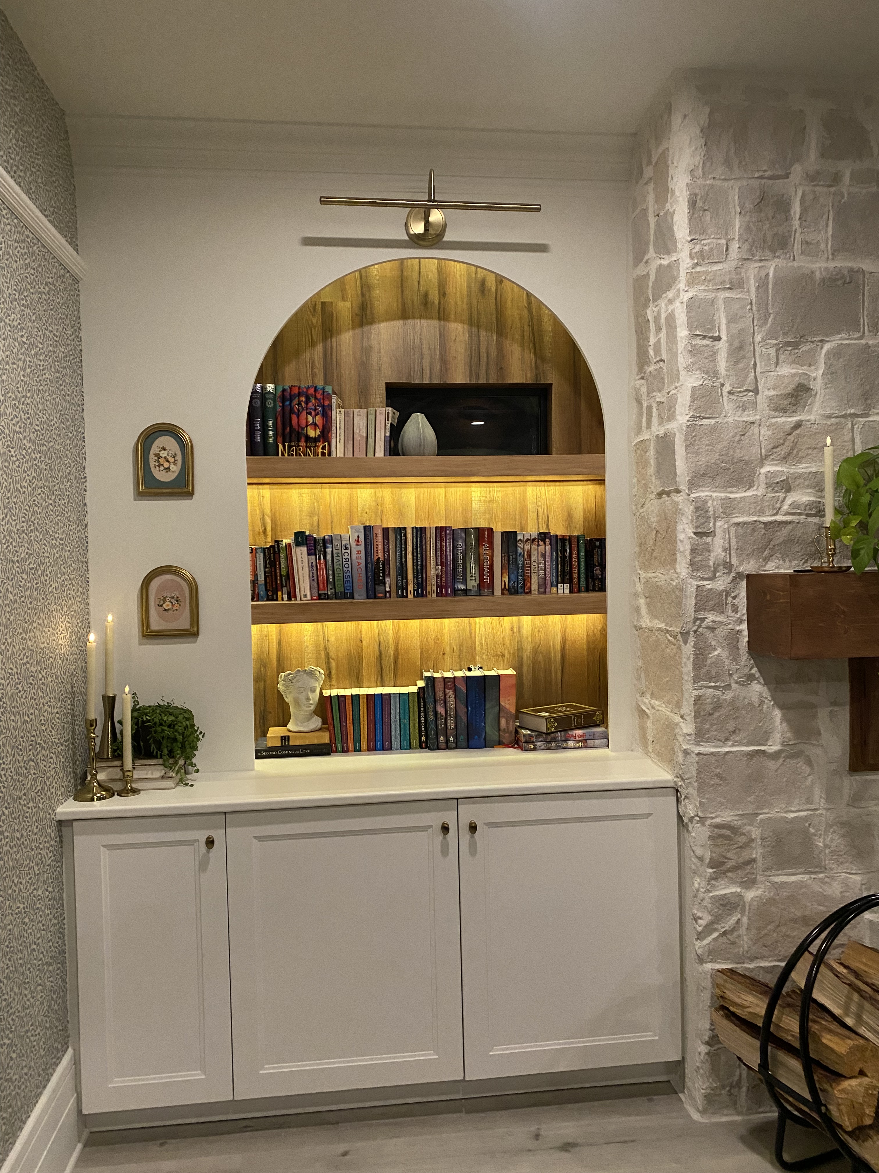Fill your new arch bookshelf with your favorite books, decorative items, and personal touches. Consider incorporating warm-toned accessories and cozy elements to enhance the inviting atmosphere. Adding a natural wood enhanced the interior part of the bookshelves.