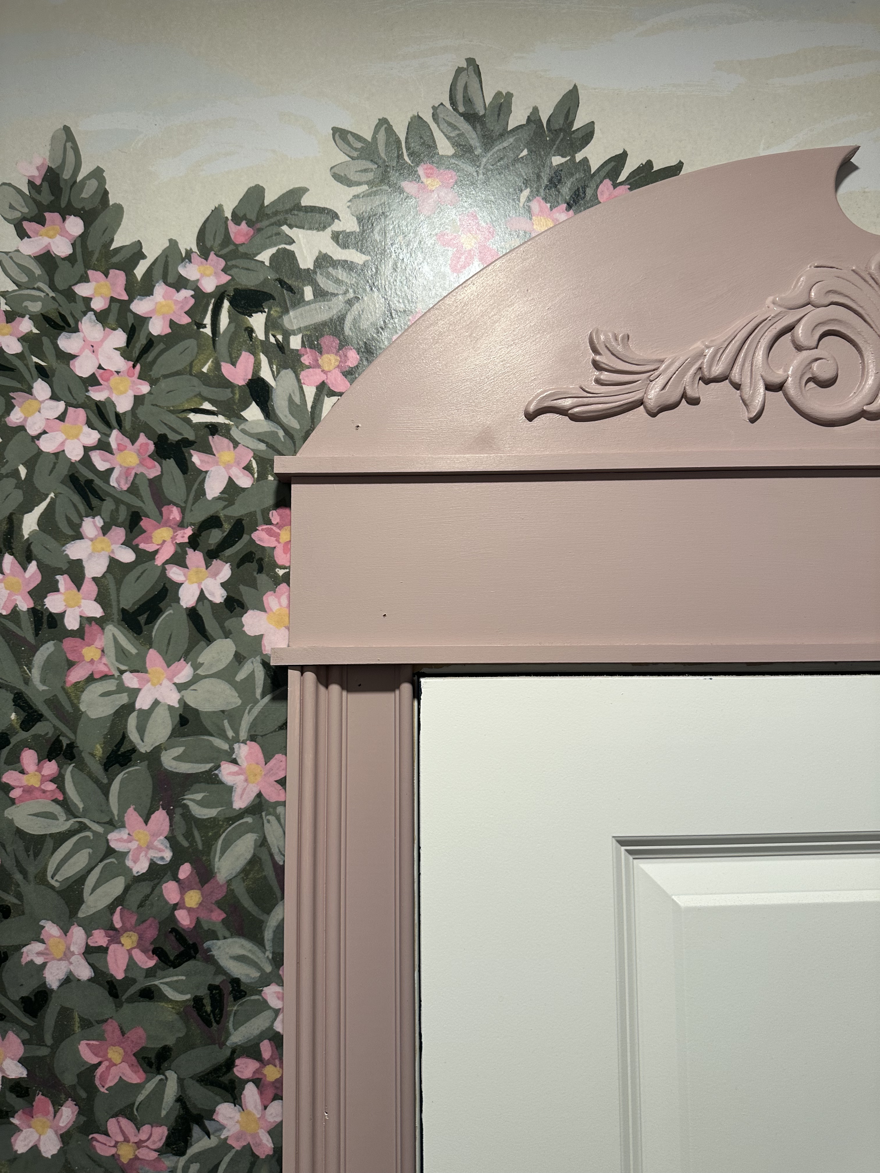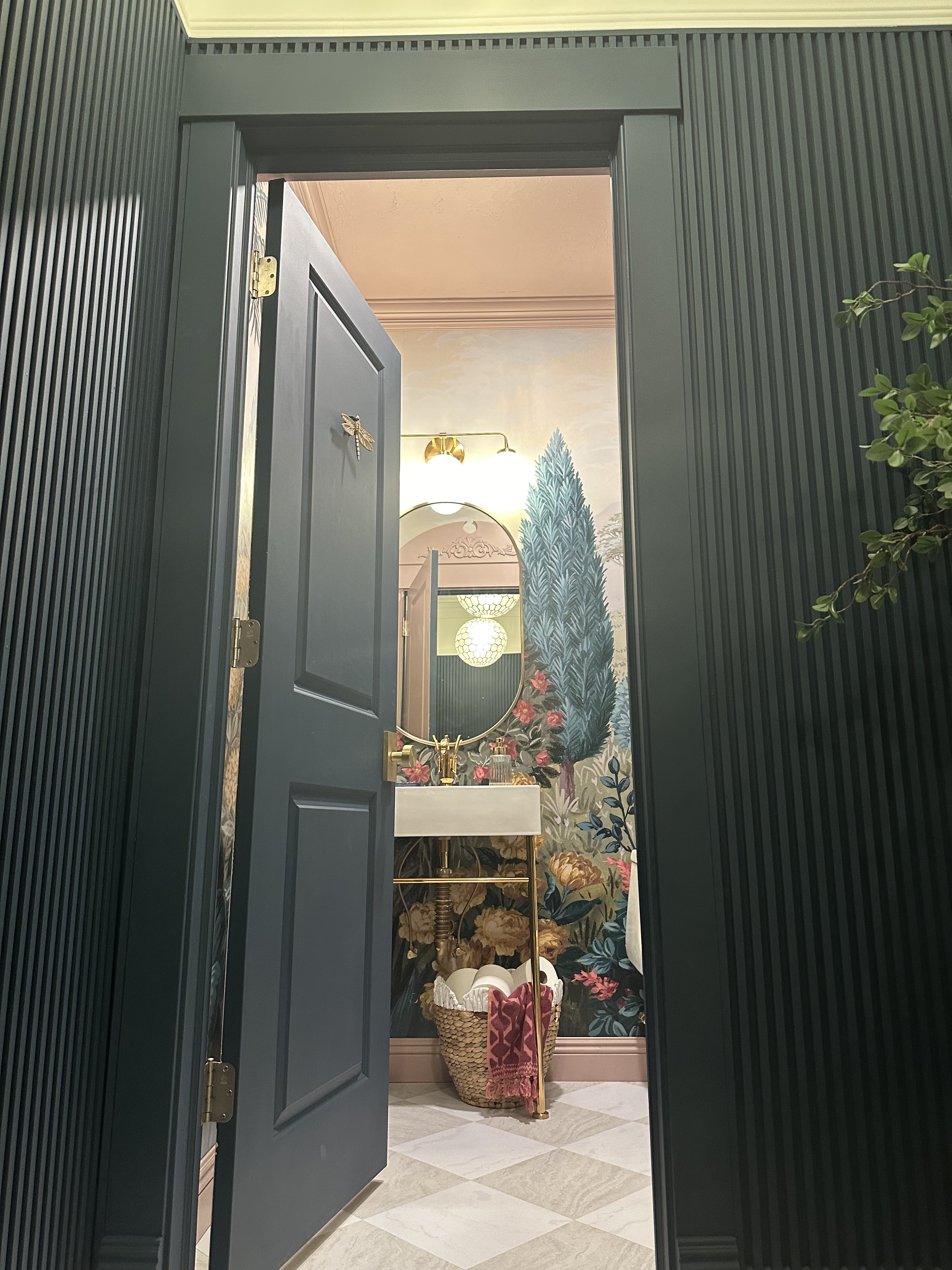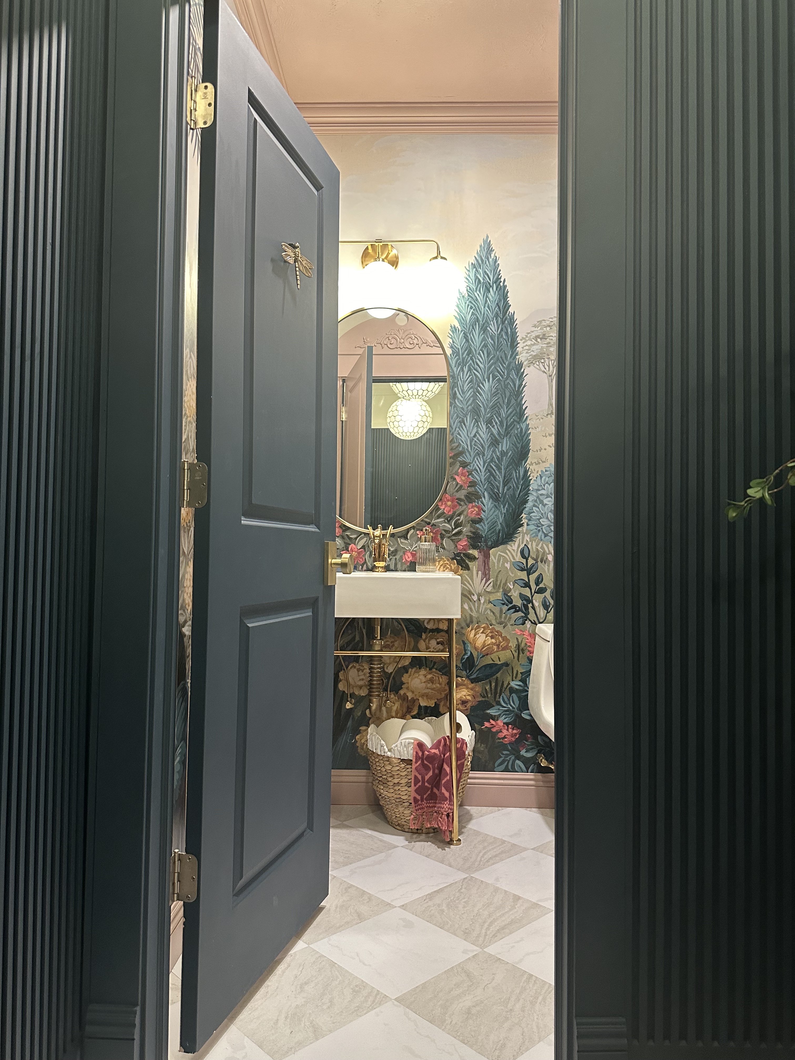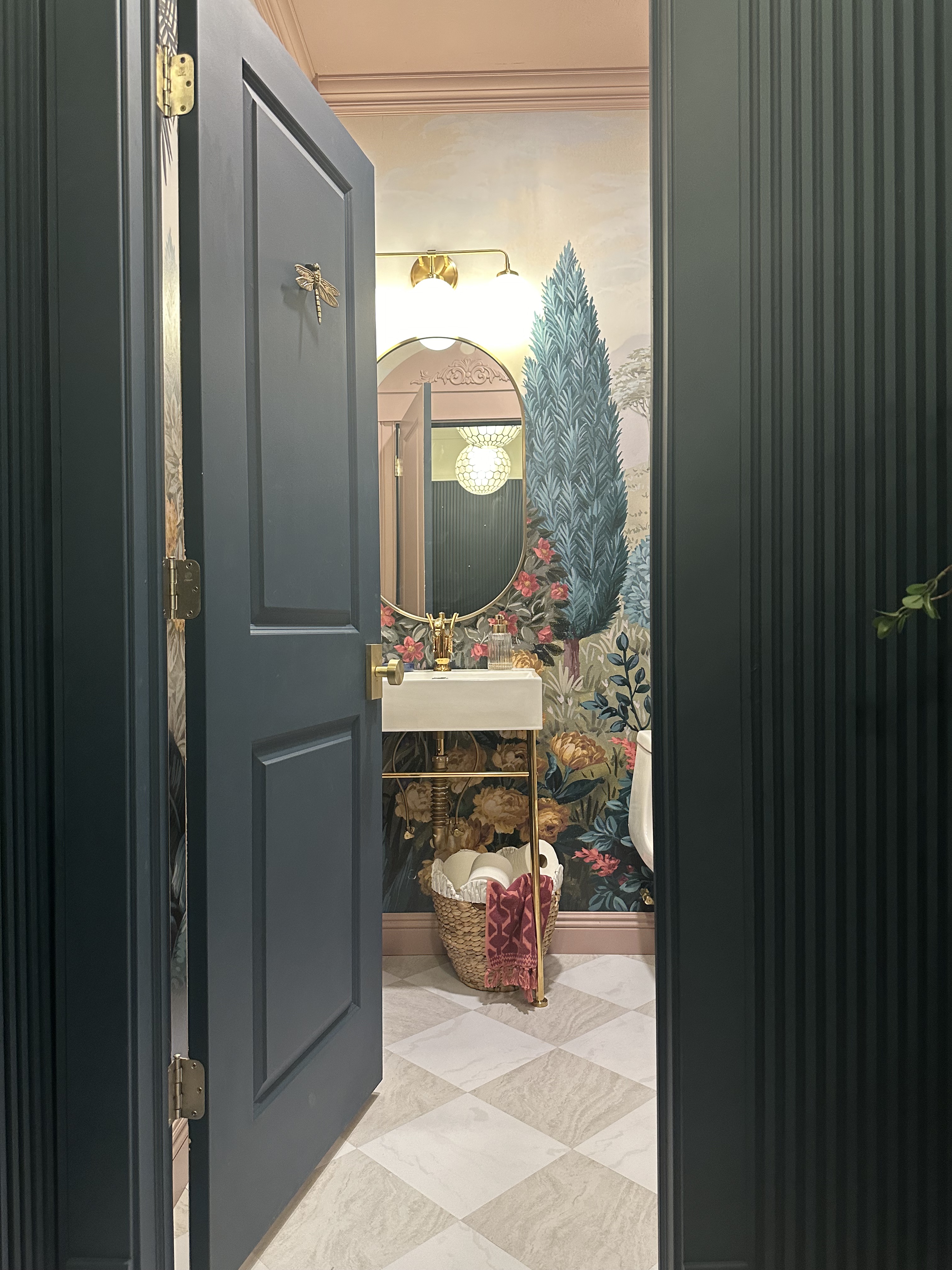 The colorful powder room makeover served as a testament to the transformative potential of thoughtful design choices. By combining the striking Photowall Wallpaper with the rich hues of Blackberry Mocha Behr paint, we were able to turn a gray mundane space into a vibrant sanctuary. Also checkout our ornamental trim post here on the door trim.