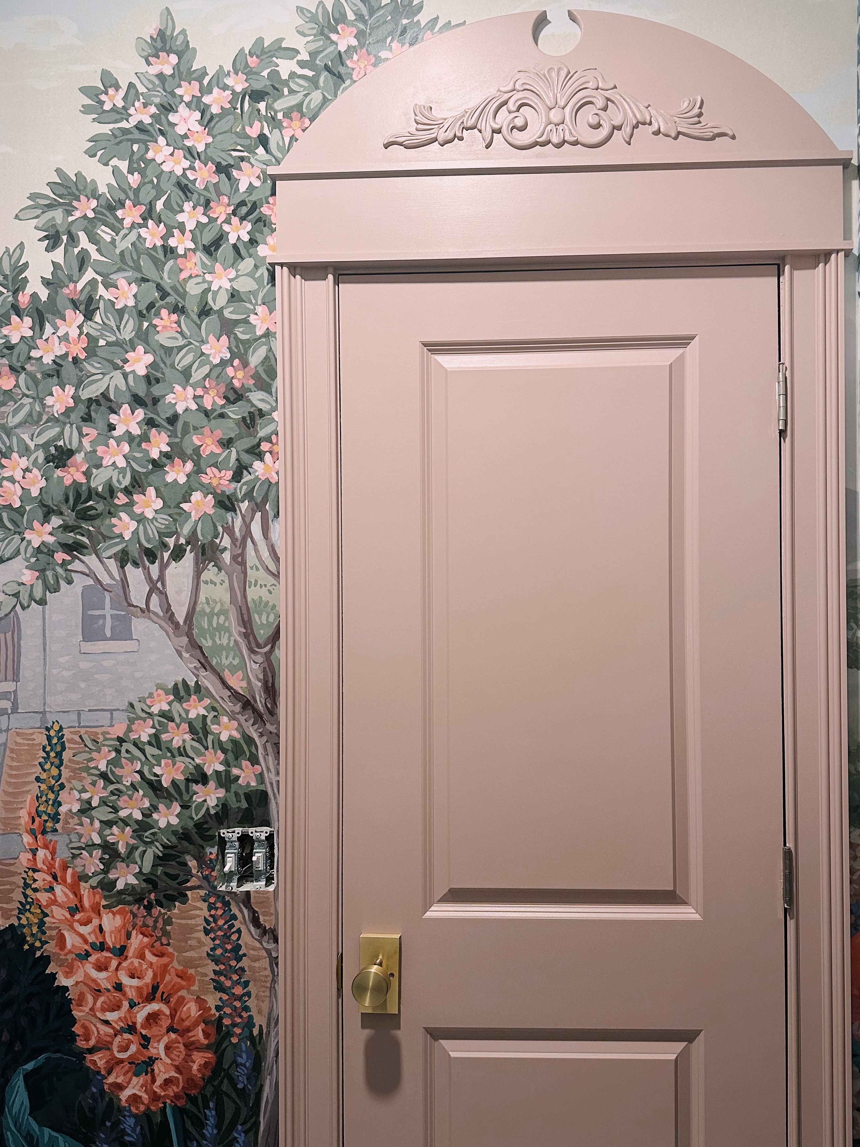 Inspired by the deep, luxurious tones of the wallpaper, we turned to Behr Paint for the perfect shade to adorn the baseboards, ceiling and crown moulding. After much sampling and consideration, we settled on “Blackberry Mocha,” a velvety hue that echoed the richness of the wallpaper while adding depth and warmth to the space. This choice not only tied the room together but also created a sense of cohesion with another recent project in our home – the butler pantry makeover, where the same paint color was employed in the base cabinets and baseboards.