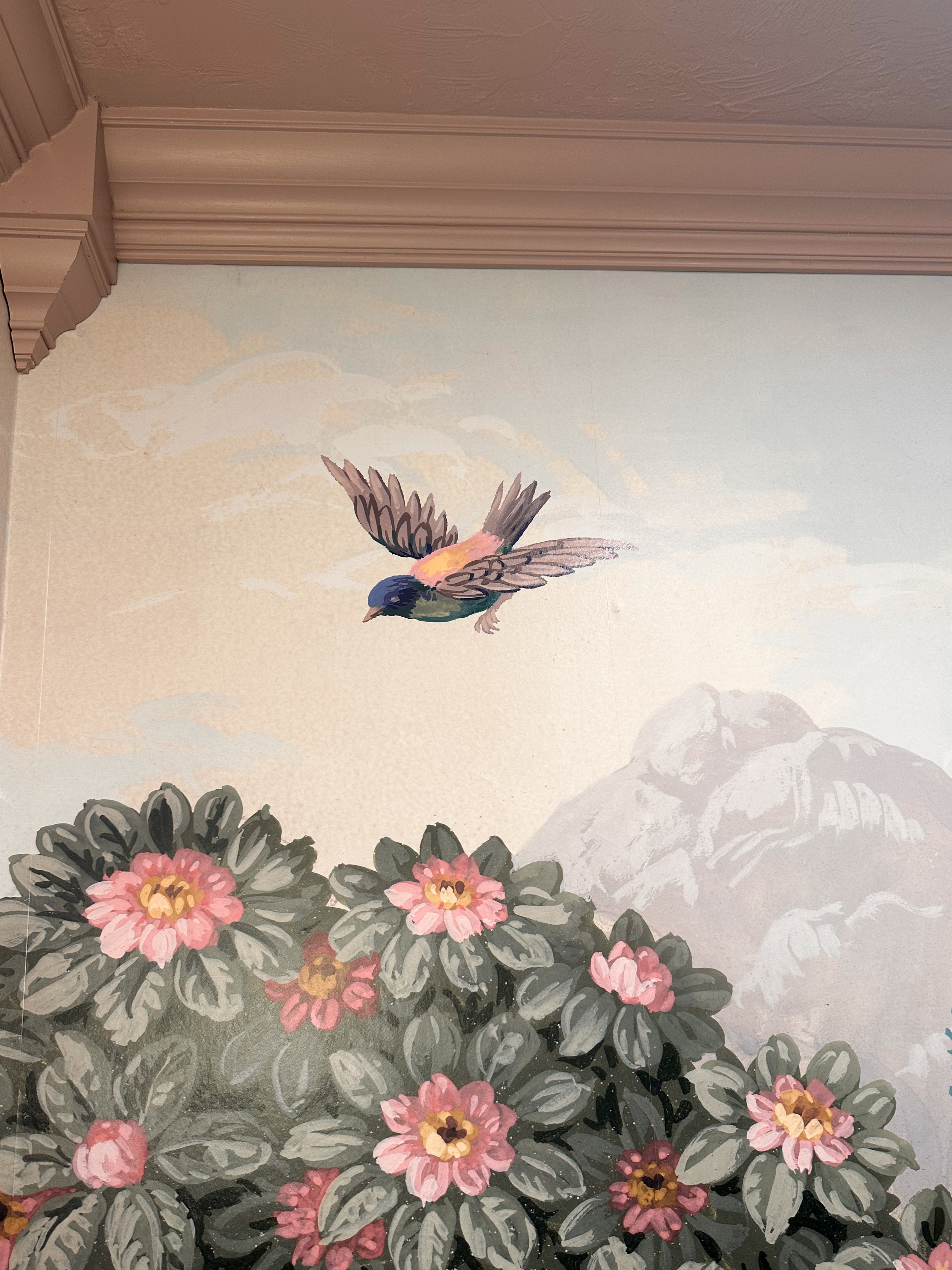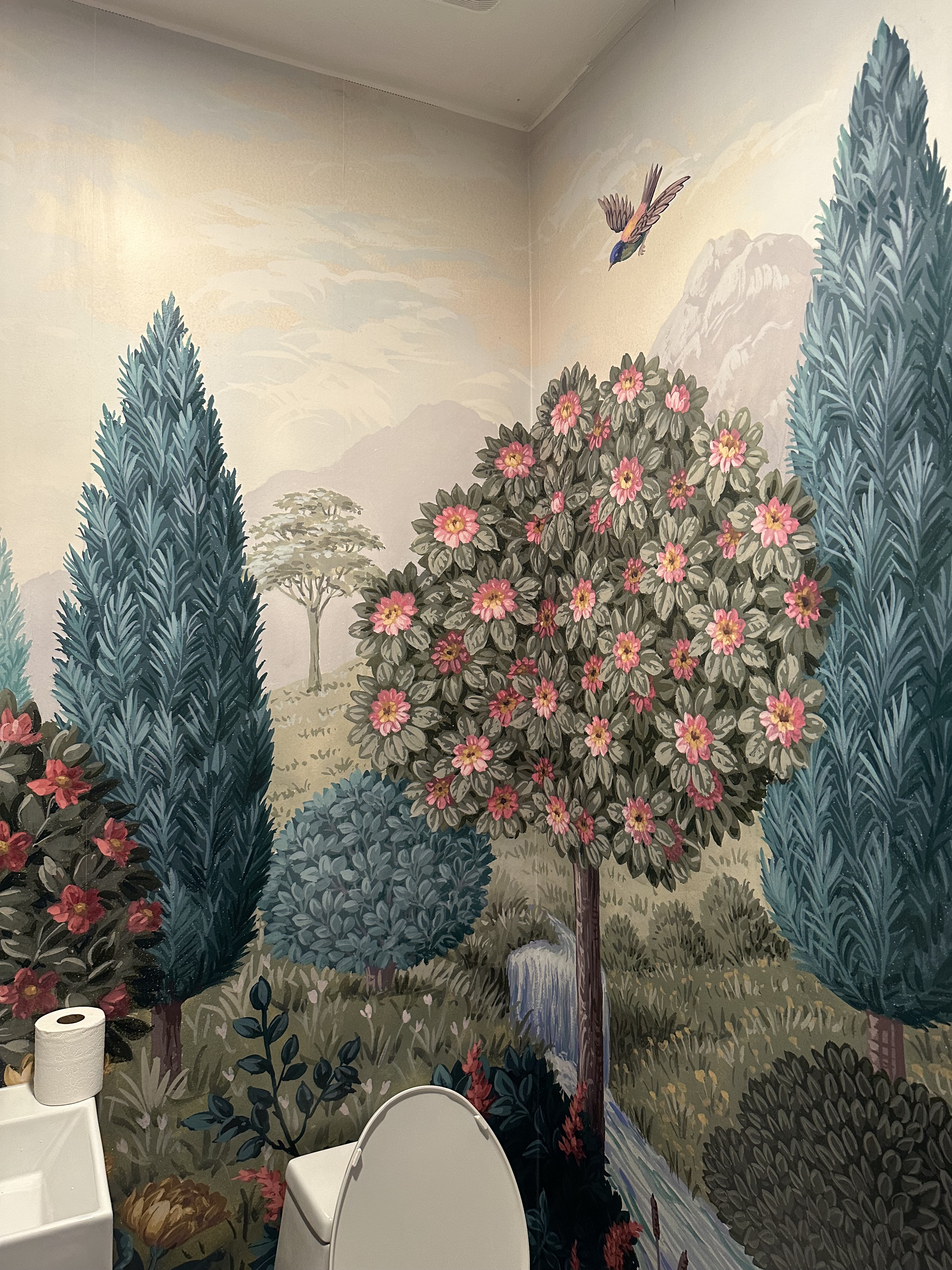 The final result was nothing short of spectacular. What was once a nondescript gray powder room now exuded personality and charm. The combination of the intricate wallpaper pattern and the rich, velvety walls created a sense of luxury and sophistication. Every visit to the powder room became an experience, a moment of indulgence amidst the hustle and bustle of daily life. Birds flying in the sky, a house in the distance, farm land, palm trees and trees of every variety of color.
