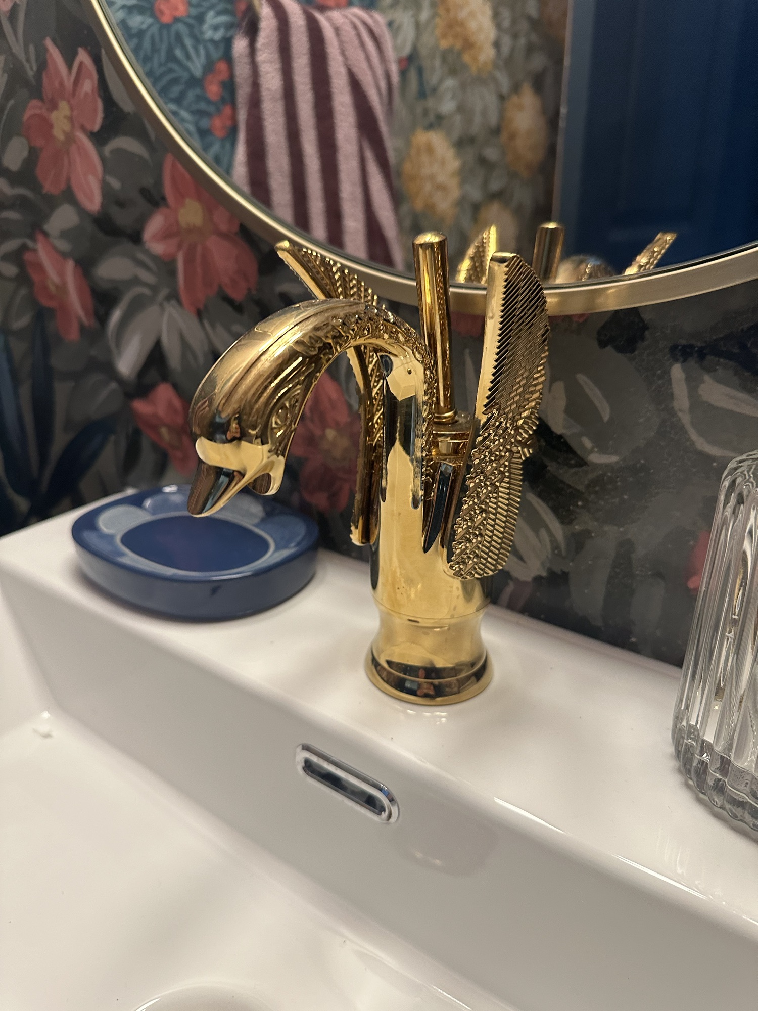 Picture this: you enter the powder room, feeling like a sophisticated swan yourself, ready to make a grand splash in the world of home decor. But as you reach for the faucet, instead of a mundane tap, you’re greeted by the graceful neck of a swan, elegantly curving down to deliver the liquid magic (although one of our young ones said “it’s like the swan is throwing up on you”). It’s like having a tiny water ballet every time you wash your hands!