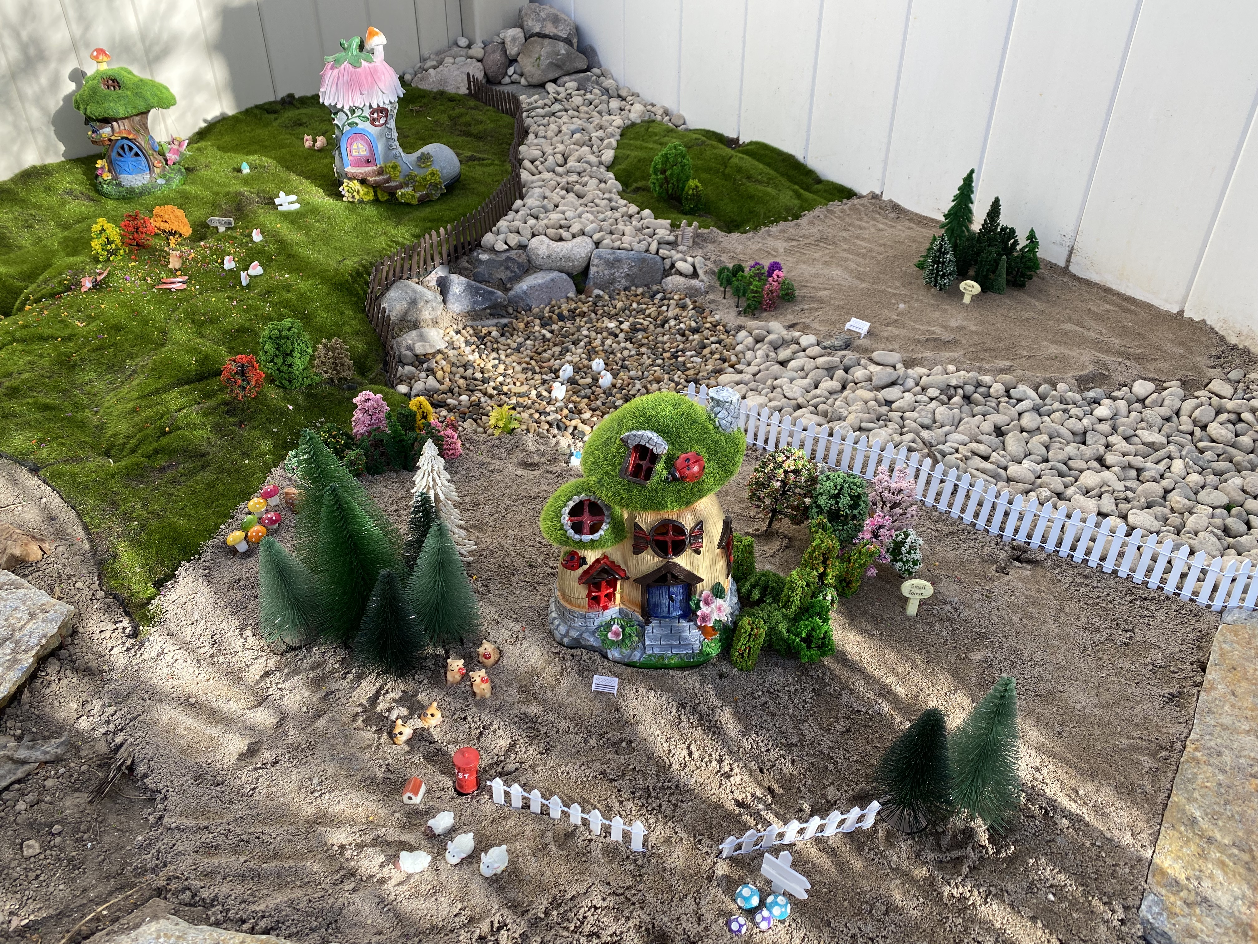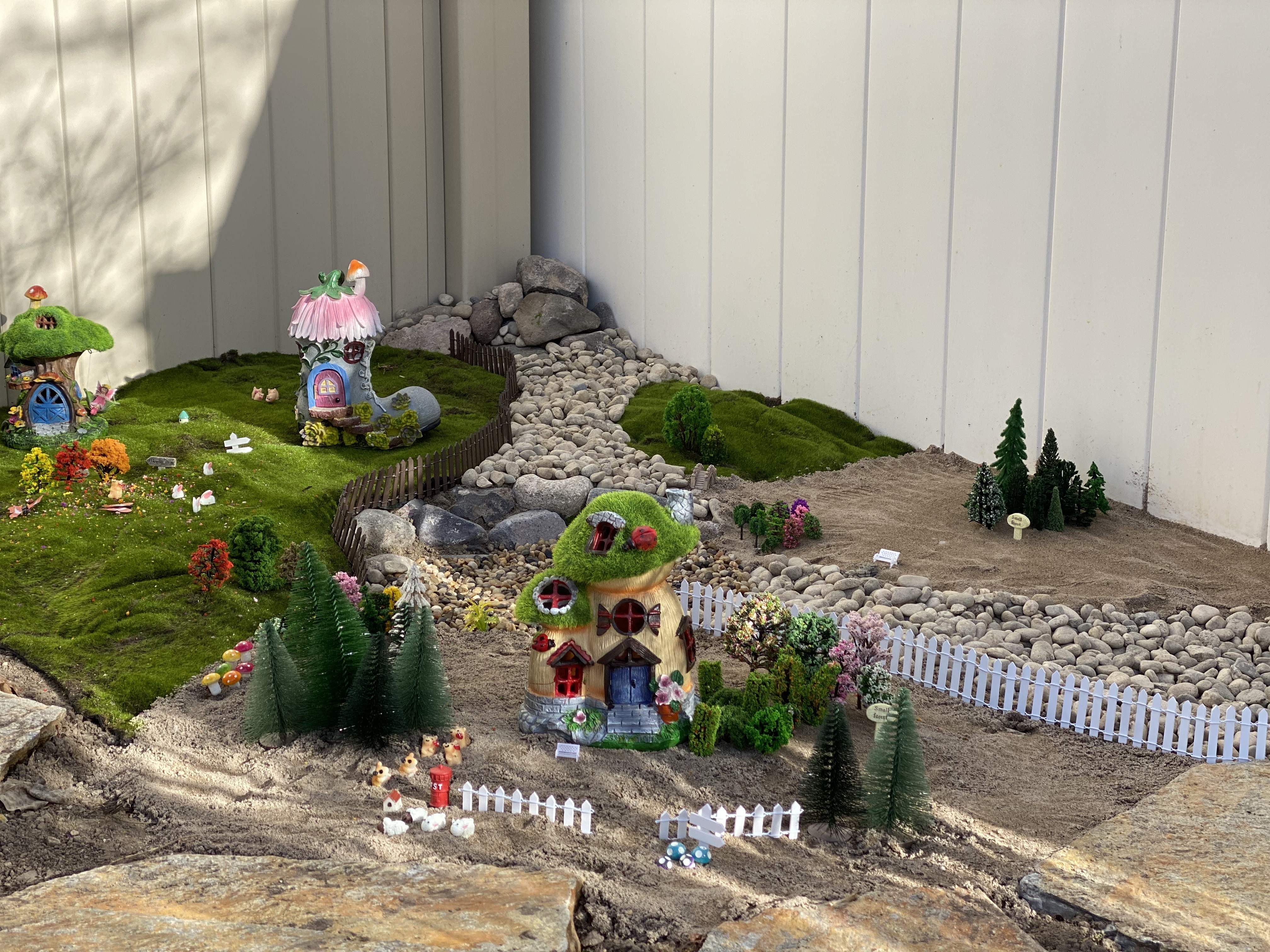 No fairy garden is complete without a sprinkle of fairy dust – in this case, the finishing touches that tie the whole design together. Scatter decorative accents such as miniature fences, garden tools, and whimsical signs throughout the space to add depth and dimension. For an extra touch of magic, incorporate fairy lights or solar-powered lanterns to illuminate your garden after dark, creating a truly enchanting ambiance. We strategically placed the garden under a tree so we could hang lights over the newly created fairy world