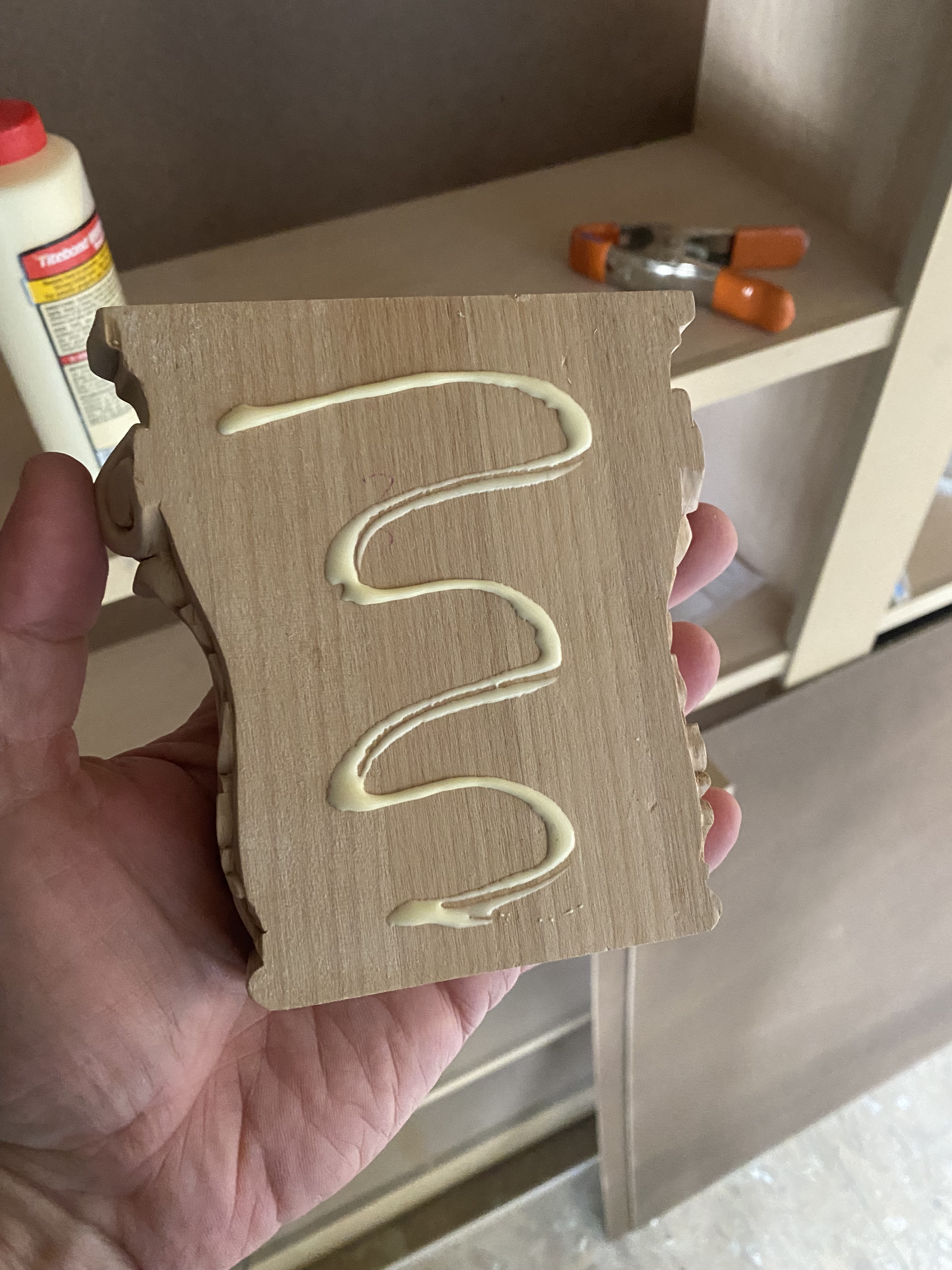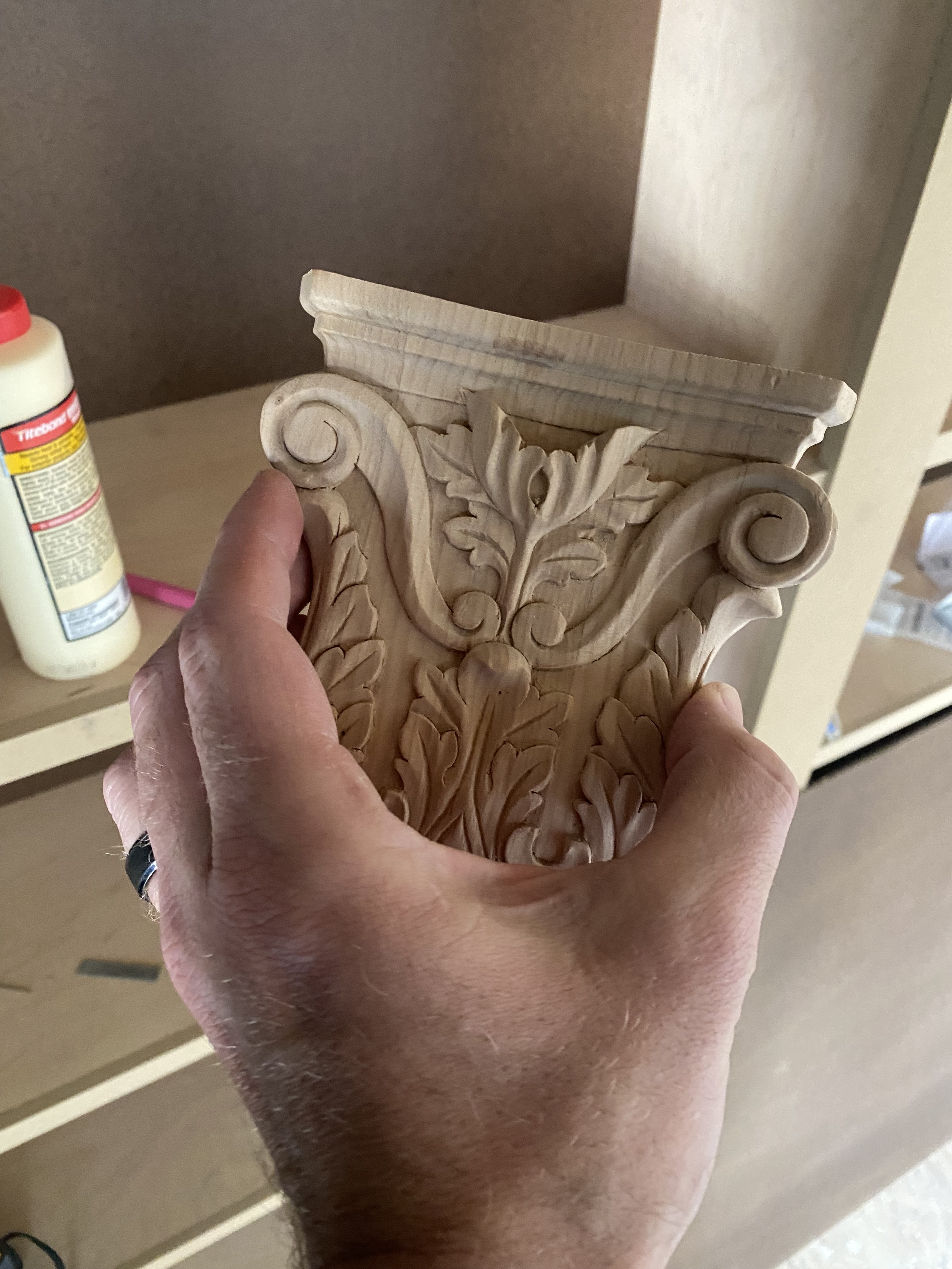 The pointed arch design already evoked a sense of old-world charm, reminiscent of Gothic cathedrals and classic European libraries. To complement this aesthetic, we chose corbels from Lowes with intricate carvings that echoed the craftsmanship of a bygone era. The delicate scrollwork and patterns on the corbels added a layer of sophistication and intricacy to the bookshelf.