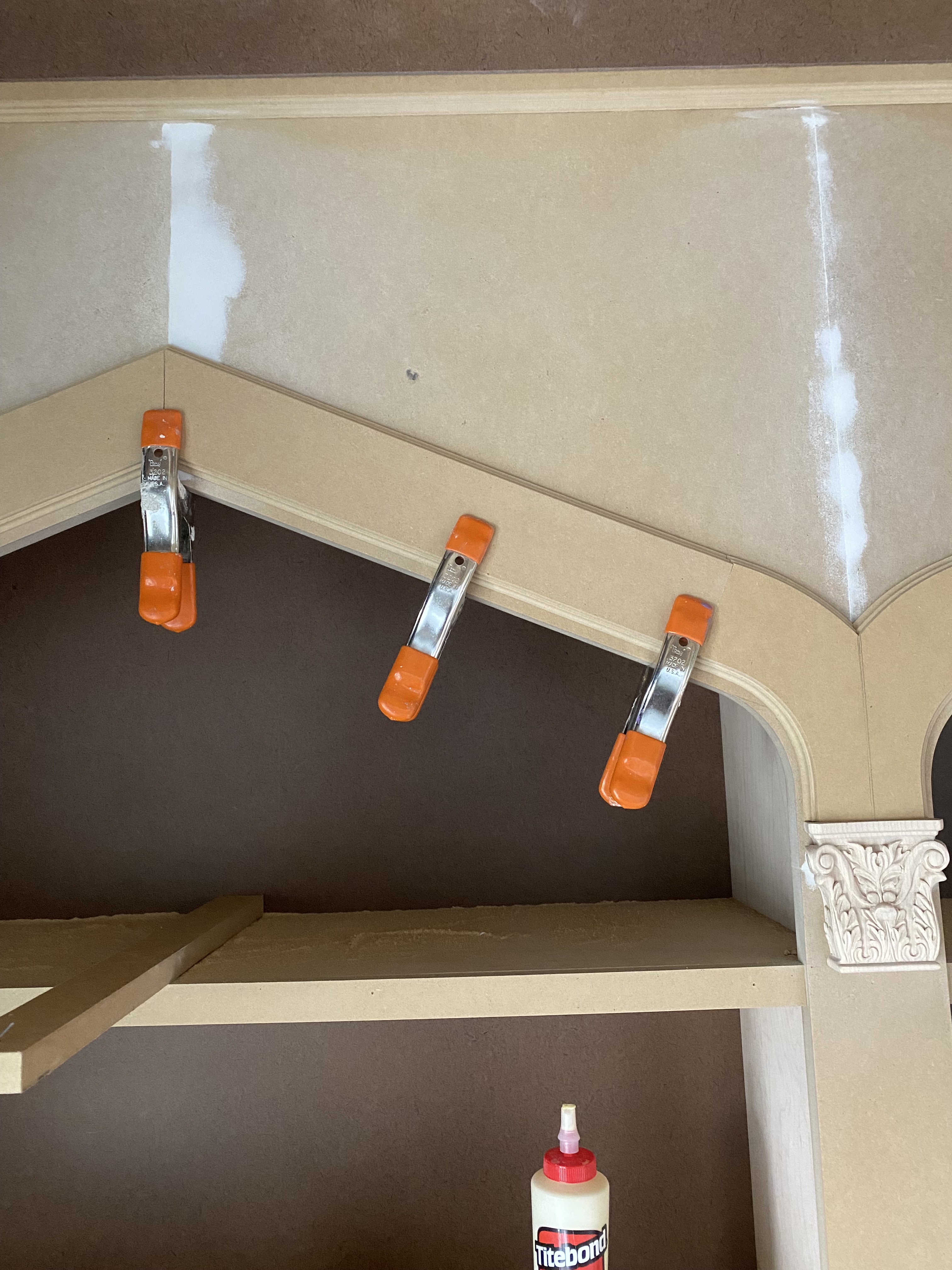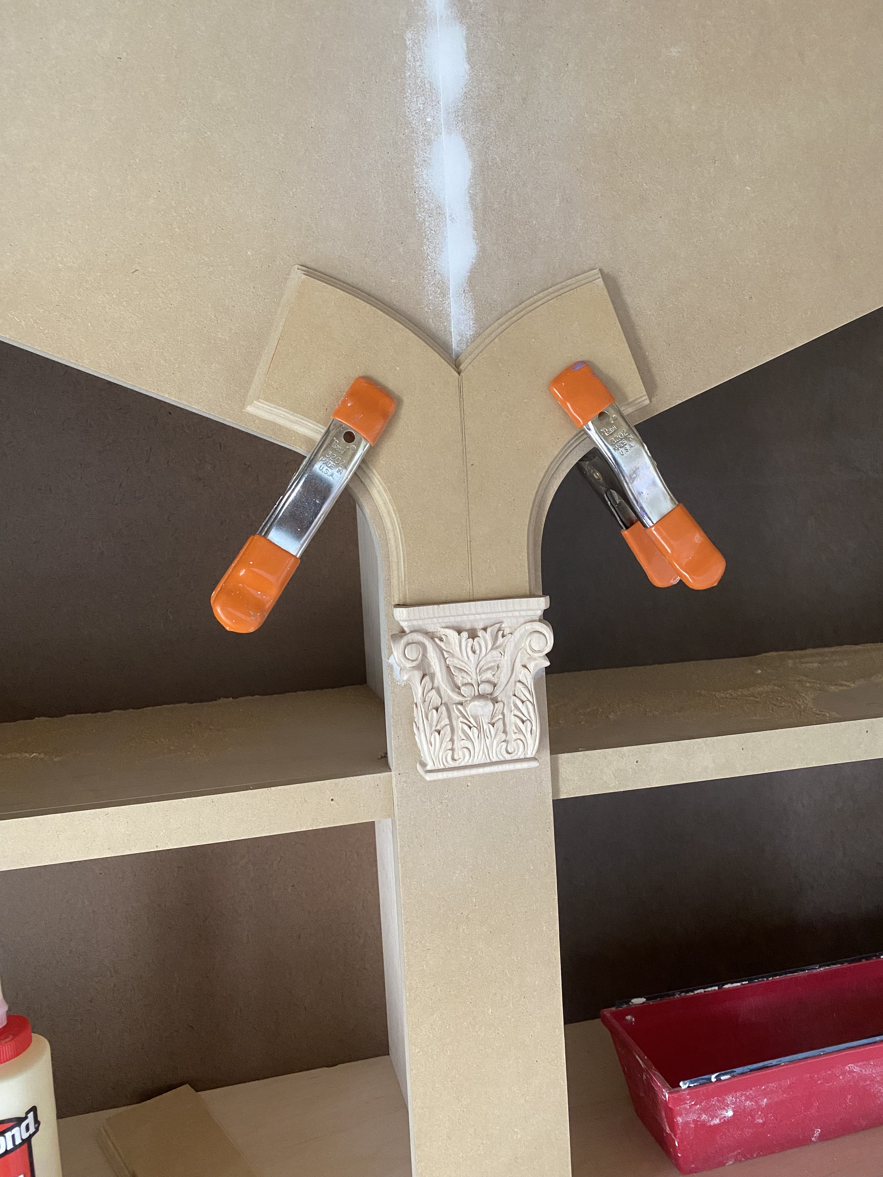 Installing the corbels was a meticulous process but well worth the effort. We carefully measured and marked the spots where the corbels would be placed, ensuring symmetry and balance. The curvature of the arch made the calculations difficult. After securing them in place with wood glue, we painted the corbels to match the trim of the bookshelf, seamlessly blending them into the overall design. The result was a bookshelf that not only held books but also stood as a testament to the elegance of detailed woodworking.