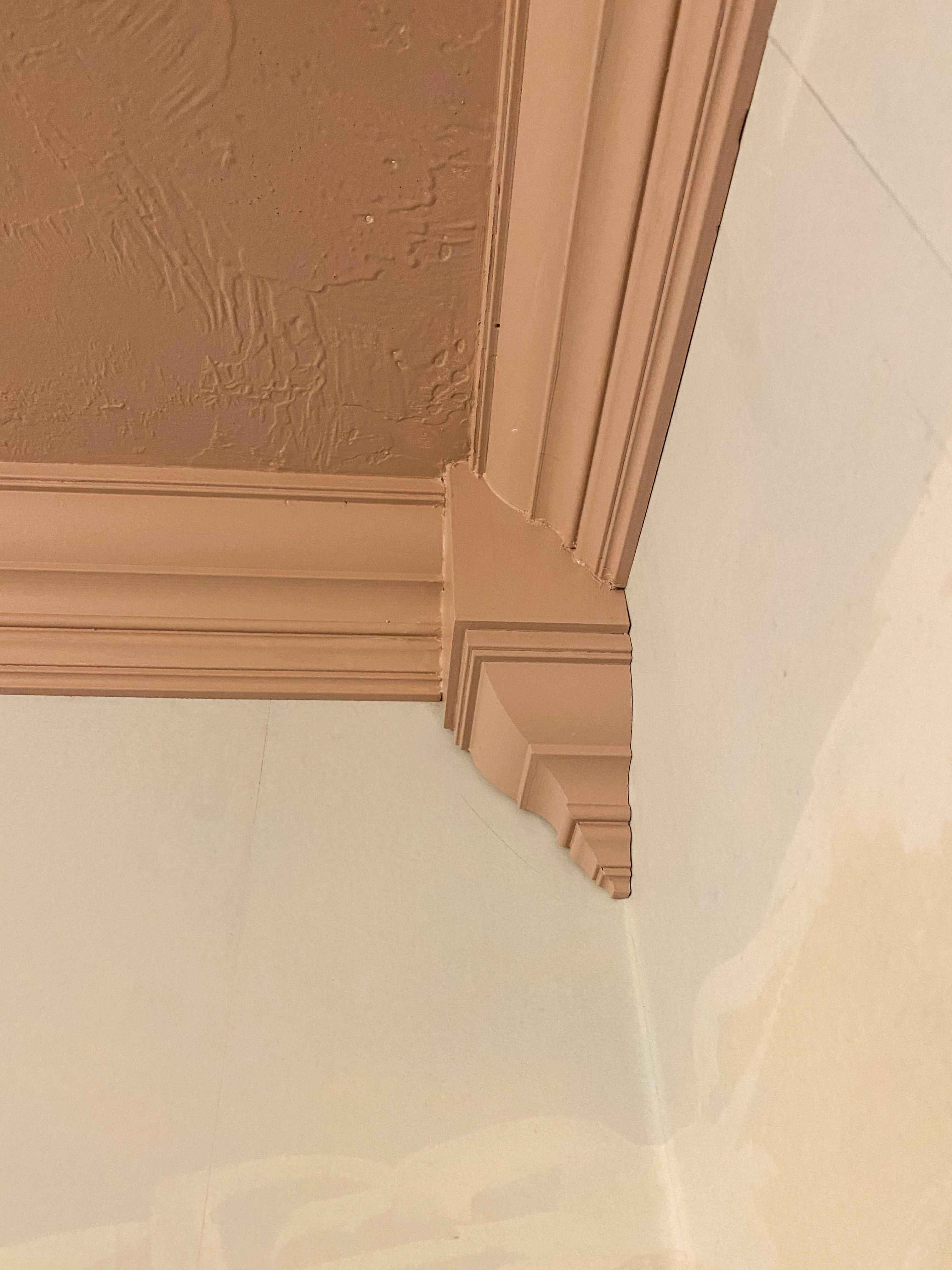 We created crown molding blocks with subtle, elegant designs that complemented the existing crown molding. If you don’t want to make these blocks on your own, your local hardware store has a variety to choose from. They can be found in the trim aisles usually in the bottom bins. These blocks were placed in the corners where the crown molding met, covering any gaps and adding a professional touch to the installation.