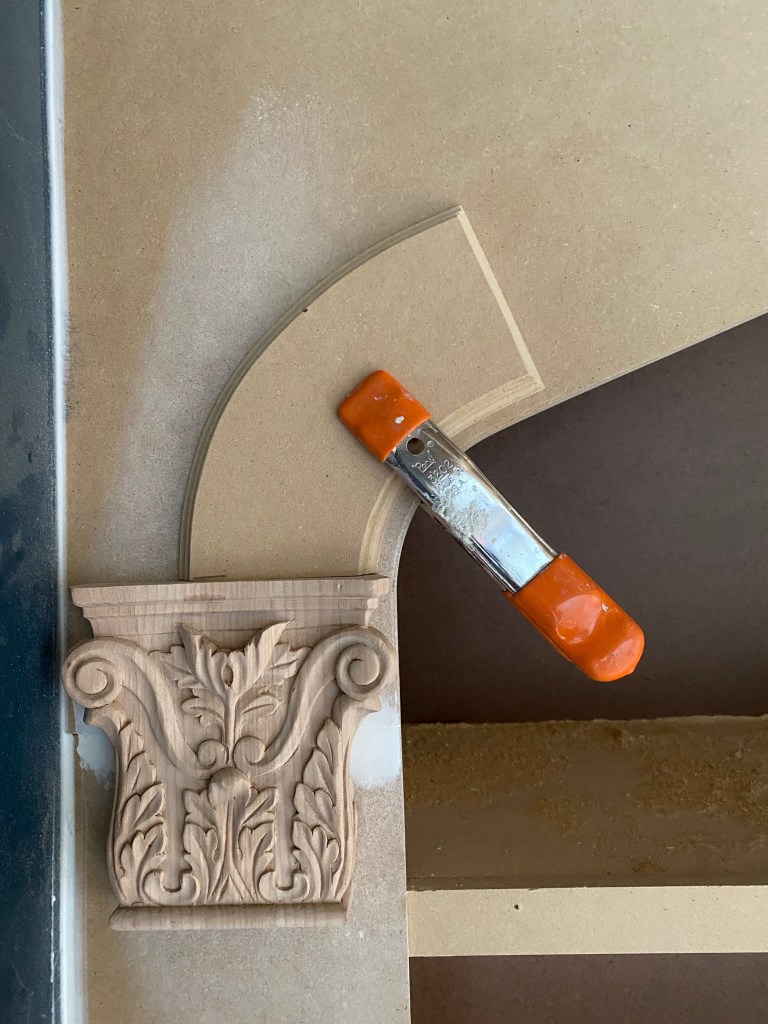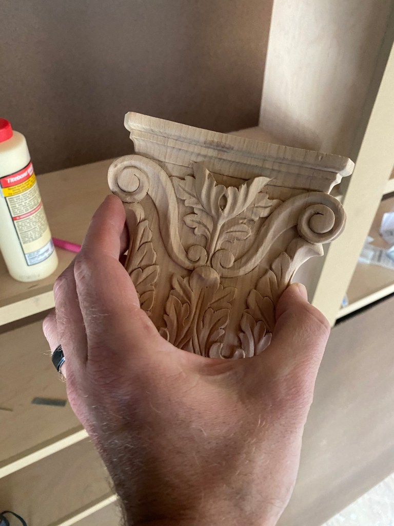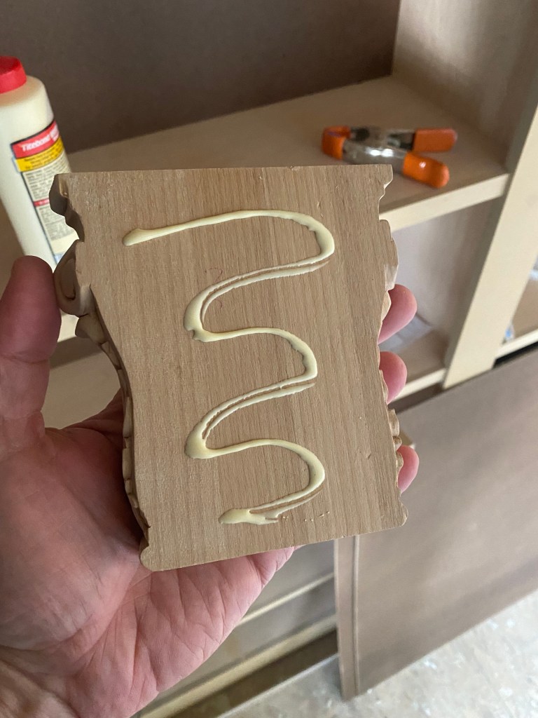 Attach the corbel appliques to the desired locations on your shelves. These can be purely decorative or serve as additional support for the shelves. Use finishing nails and a bit of wood glue for added strength.